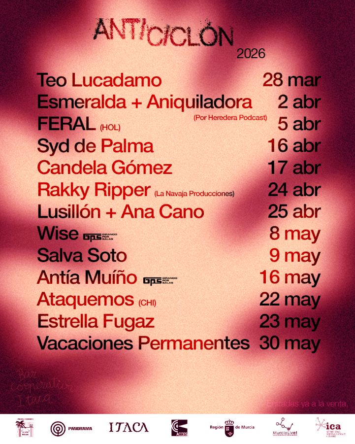 La Cooperativa Ítaca amplía su programación musical con el nacimiento de ANTICICLÓN, un nuevo ciclo que se celebrará del 27 de marzo al 30 de mayo, sumando 13 fechas y 15 conciertos. Hermano pequeño de Ciclogénesis, ANTICICLÓN comparte su filosofía —formato íntimo, cercanía y cuidado artístico— pero abre el foco hacia una programación más ecléctica y permeable a distintos lenguajes del pop contemporáneo.